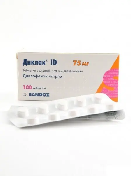 Diclak ID tablets are a medication containing 75 mg. of diclofenac, a nonsteroidal anti-inflammatory drug (NSAID) known for its analgesic and anti-inflammatory properties. Each package contains 100 tablets, providing a convenient and effective treatment option for various conditions.