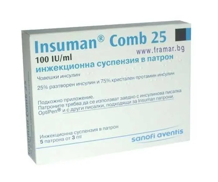 Insuman Comb 25 Suspension for Injection is a medication available in the form of cartridges containing 3 ml. of solution. Each cartridge contains 100 IU/ml of the active ingredient. It is commonly prescribed for the treatment of diabetes mellitus to help regulate blood sugar levels.