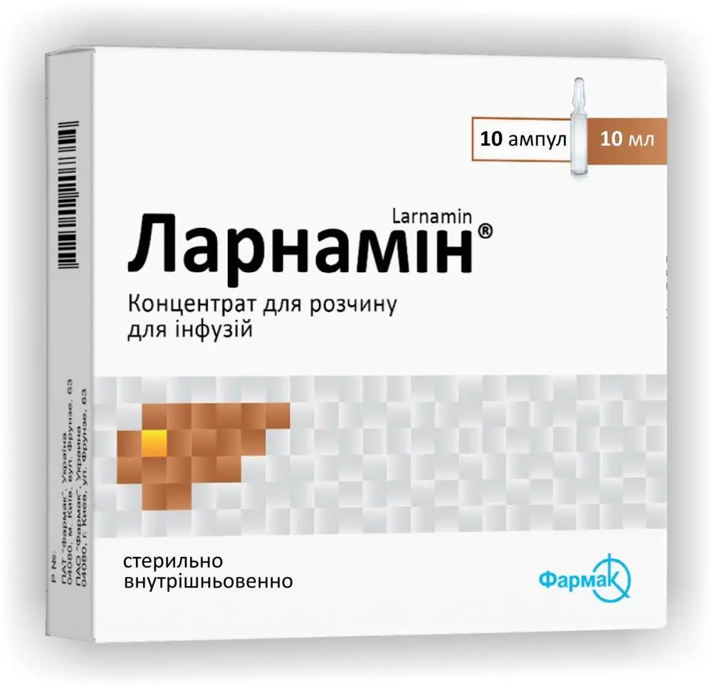 Larnamin Concentrate for Infusion is a medication available in the form of 10 ml. ampoules, each containing 500 mg/ml. of the active ingredient. This medicine is commonly prescribed for various medical conditions and is administered through intravenous infusion.