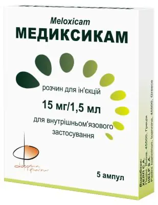 Medixicam is a medication that contains the active ingredient meloxicam in a concentration of 15 mg. per 1.5 ml. It is available in a package of 5 units. Meloxicam is a nonsteroidal anti-inflammatory drug (NSAID) that is commonly used to reduce pain, inflammation, and stiffness caused by conditions such as arthritis, osteoarthritis, and rheumatoid arthritis.