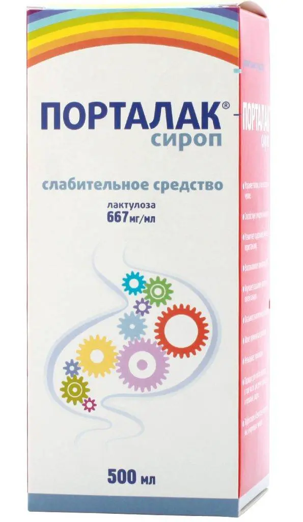 Portalak syrup with lactulose is used to treat constipation and liver conditions by softening stool and increasing bowel movements in a 667 mg/ml concentration in a 500 ml vial for oral administration.