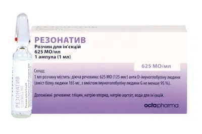 Rezonativ is a medication that contains anti-D human immunoglobulin in a concentration of 625 IU/ml. It is available in the form of a 1 ml. ampoule, with each package containing one ampoule.