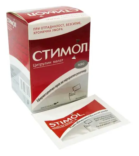 Stimol is a medicinal product in the form of an effervescent powder designed for oral consumption. It contains Citrullin Malate as its active ingredient, with each sachet delivering 1 g of this compound. Citrullin Malate is a combination of the amino acid L-citrulline and malic acid, known for its potential health benefits.